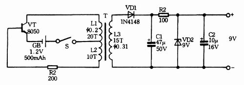 如图所示是一种利用1.2V、500mAh的镍镉电池做电源的逆变电源电路,输出直流电压为9V,可供数字式万用表使用。图7-72中变压器T利用15mm的磁环穿绕而成(元器件参数图中均已标注人名为数字万用表的电源开关。