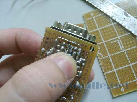 首先,要切割一块合适的电路板。这里我用多孔的万用板,我做小东西时通常都是使用它,很方便,不过做复杂一点就不太好了。当然有条件可以自已加工印刷电路板,呵,笔者认为这小小的DIY电路就用不着加工印刷板了。一般购买到的万用板都比较大,这里我们可用锯片或界刀来切割一块大约4cm*3cm的电路板(如图四)。可用砂纸修饰一下电路板的边缘使其光滑,搞定之后就是对着电路图插上元件,焊、焊、焊!哦,串口插座插不下去?可用尖嘴钳轻轻对着电路板的孔位,稍微钳弯一下插座的引脚就可以顺利插上去焊好了。图五就是焊好的板子,这里看到的是修改过几次电路的,焊点就不太好了:P 图六是还没有插上 AT89C2051芯片的完成品,接下来就是烧写单片机程序了,没有烧写器就只有出钱请别人烧了,到电子市场或专修电脑BIOS的地方都有代烧芯片的服务。且慢,先下载这个编译好的单片机程序吧。IR.hex