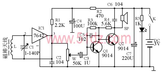 TA7642是一只微型集成电路,外形和TO-92封装的三极管(如9014)相同(见图)。别看它体积很小,它的内部却集成了10只三极管,包括三级高放、一级检波和一级低频缓冲放大。 本站实验套件中有采用TA7642收音IC制作的简易收音机,引脚已经焊好连接线,并且还有用热收缩胶管缩紧。确保多次使用不易断开。原理图如下。