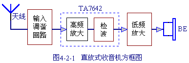TA7642收音IC制作的简易收音机,是一款适合初学者装配学习的简易型收音机,从天线接收进来的许多电台的高频信号,通过输入调谐回路选择,使得只有我们需要的那个台才能顺利进入下一级;由输入回路传输过来的高频信号是极其微弱的,还必须进行足够的放大,这叫高频放大,简称高放。高频信号放到足够大了,是不是就行了呢?也不行。下一步还要进行检波,检波的目的是把调制在高频载波上的低频信号取下来。检波后的信号同样是很微弱的,最后还要经低频放大再送到耳机还原成声音。其工作方式为直接放大式,它的工作方框图见图4-2-1。