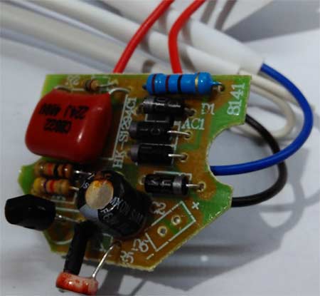 电路工作原理:C1 R1阻容降压,R2为电容放电电阻,经过D1~D4全波整流后,C2滤波;三极管B极电压由R3和光敏电阻分压决定,当环境亮度足够时,R5阻值较小,B极电位较低,三极管不导通,LED熄灭,当环境亮度不足时,R5阻值升高,B极电压随之升高,达到3只LED串联压降+0.7V后,三极管导通,LED得电工作。D5和D7装的是发白光二极管,D6装的是七彩二极管;为他发光二极管焊接牢固本站已经经工厂的机器将发光二极管串联焊接了。大家就用电烙铁焊接也是可以的,不过不够牢固。